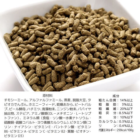 | ご注意 | ※本品はモルモット用です。それ以外の動物には与えないでください。 ※本品は自然の原料を使用しているため、表面がべたつく場合がありますが、品質には問題ありません。 ※粒の色がパッケージの写真と異なる場合がありますが、品質には問題ありません。 |