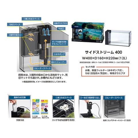 コトブキ工芸 サイドストリーム400 40×16×22cm 水槽セット オールガラス 小型水槽 4972814520134 金魚 メダカ 水槽 メダカ水槽 寿 KOTOBUKI スターターセット スタートセット 飼育セット 飼育 アクア アクアリウム アクア用品 アクアリウム用品 medakasuisouset ブラックシリコン おしゃれ シンプル サイドストリーム スリム水槽 熱帯魚 エビ グッピー テトラ ベタ 海水魚 淡水魚 水草水槽 海水水槽 淡水水槽 海水 淡水 淡水・海水両用 ガラス水槽 一体型水槽 オールインワン水槽 インテリア水槽 飼いはじめ 飼い始め 魚 水槽セット オールガラス水槽 オールガラス水槽セット ガラス水槽セット kak y26m03 20260301 bnr2604newkoto