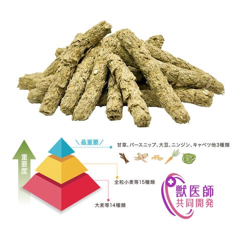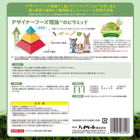 ●デザイナーフーズ理論に基づいたフード設計の牧草代用食です。 ●デザイナーフーズ理論とは、1990年代にアメリカで健康と食生活は関連しているとの考えに基づいて研究され導き出された理論です。数ある食品から40種類の植物製食品が選ばれ、重要度に応じてピラミッド型に表されています。(健康維持に重要な野菜を厳選し配合しています) ●牧草嫌い・えり好みする草食小動物に最適です。 ●アメリカ国立がん研究所が提唱した最も重要な植物を5種類配合(甘草、パースニップ、大豆、ニンジン、キャベツ)しました。 ●繊維質が豊富で牧草の代わりとしてお使い頂けます。 ●小麦粉不使用グルテンフリーです。 ●3種の牧草配合でおなかの健康維持、適度な硬さの牧草代用ペレットを齧って不正咬合ケアにも配慮しました。 |