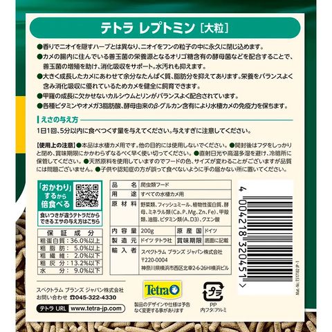 爬虫類 水棲カメ用品 餌 エサ ごはん ご飯 えさ フード 水棲 水棲カメ 亀 カメ 水棲亀 くいつき 嗜好性 健康 カルシウム ビタミン カメのエサ カメのごはん クサガメ ミドリガメ カブトニオイガメ テラピン 水棲ガメ ペレット ペレットフード kak テトラ レプトミン 大粒 200g 4004218320451 y25m02newrep kame2025m テトラ レプトミン 大粒 200g 20260304 kak y26m03
