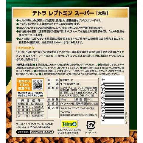 爬虫類 水棲カメ用品 餌 エサ ごはん ご飯 えさ フード 水棲 水棲カメ 亀 カメ 水棲亀 くいつき 嗜好性 健康 カルシウム ビタミン カメのエサ カメのごはん クサガメ ミドリガメ カブトニオイガメ テラピン 水棲ガメ ペレット ペレットフード kak テトラ レプトミンスーパー 大粒 260g 4004218320413 y25m02newrep kame2025m テトラ レプトミンスーパー 大粒 260g 20260304 kak y26m03