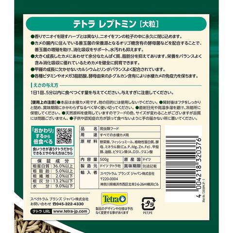 爬虫類 水棲カメ用品 餌 エサ ごはん ご飯 えさ フード 水棲 水棲カメ 亀 カメ 水棲亀 くいつき 嗜好性 健康 カルシウム ビタミン カメのエサ カメのごはん クサガメ ミドリガメ カブトニオイガメ テラピン 水棲ガメ ペレット ペレットフード kak テトラ レプトミン 大粒 500g 4004218320376 y25m02newrep kame2025m テトラ レプトミン 大粒 500g 20260304 kak y26m03