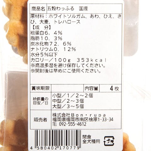 ボンルパ Bon-rupa 五穀わっふる 4枚 4580402170779 犬 犬フード ドッグフード ドッグ いぬ 犬おやつ おやつ 間食 ご褒美 ナチュラル 全犬種 日本産 日本製 国産 無添加 グルテンフリー さくさく サクサク食感 ワッフル 五穀 個包装 あわ 粟 ひえ 稗 きび おおむぎ 大麦 個別 持ち運び スイーツ お菓子 おかし クッキー 個包装 20260312 y26m03 ngtk