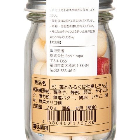 ボンルパ Bon-rupa 苺とみるくは仲良しさん♪ 20g ボトルタイプ 4580402170786 犬用品 犬フード 犬 いぬ イヌ ワンちゃん 犬用 いぬ用 イヌ用 おやつ ごほうび ご褒美 国産品質 国産 安心 厳選した食材 素材そのまま 無添加 ナチュラル 苺 いちご ストロベリー ミルク みるく 山羊ミルク ヤギミルク 甜菜オリゴ糖 クッキー 小さい スナック チップス 食べやすい ギフト かわいい 可愛い プレゼント 贈答 20260312 y26m03 ngtk
