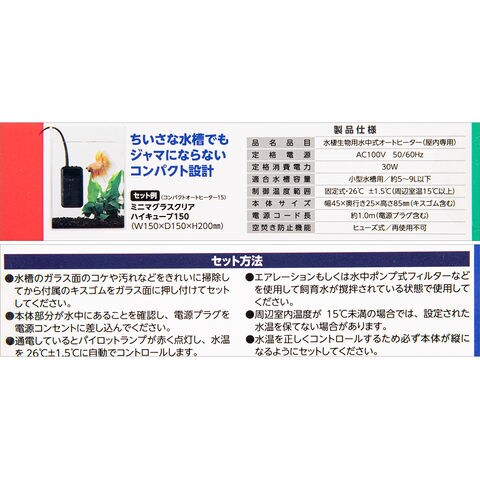 | ご注意 | ※本品は屋内用水棲生物飼育専用用品です。目的以外の用途では使用しないでください。 ※本品はガラス水槽専用です。 |