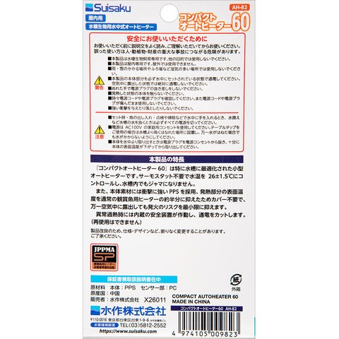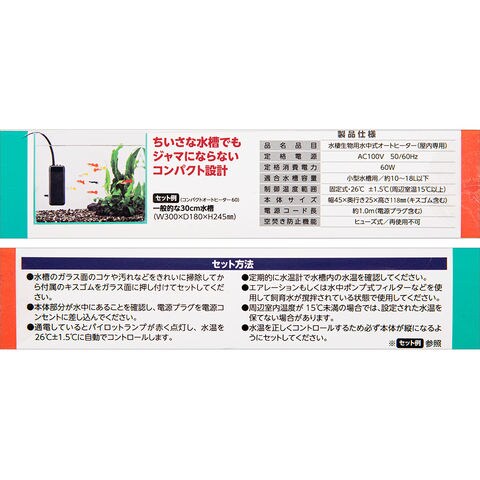 アクアリウム用品 アクア用品 アクア アクアリウム 熱帯魚 観賞魚 ベタ めだか 金魚 小魚 小型魚 水槽 ヒーター 保温 冬 温度調節 保温用品 温かい 暖かい あったかい 寒さ対策 小型水槽 ドワーフクラブ 水作 水槽用 水槽用ヒーター サーモスタット サーモ 一体 温度固定 固定式 温度固定式 ガラス水槽 ガラス水槽専用 生体 小型 コンパクトオートヒーター60 60W kak y26m03 20260416 4974105009823