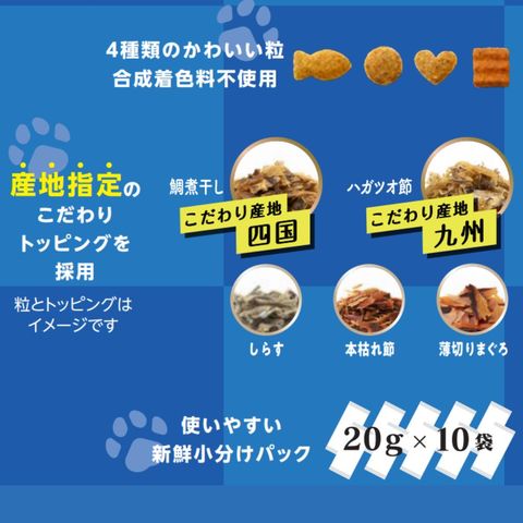 | 特長 | ●トッピングされた5種類の小分けアルミ蒸着分包+脱酸素剤で美味しさをキープします。 ●トッピングには、産地にこだわった「四国産鯛煮干し」や「九州産八ガツオ節」も使用しています。 ●合成着色料不使用!毎日のごはんや、とっておきのおやつ、トッピングにおすすめのドライフードです。 |