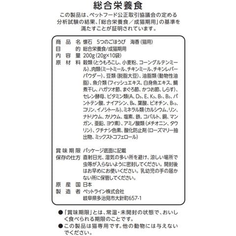 メーカー画像 キャットフード 懐石 5つのごほうび 海香 200g(20g×10袋) 4902418005522 猫 ねこ 猫用 ねこ用 カリカリ 猫餌 ねこ餌 ドライフード ドライ グルメ トッピング アソート 小分け 小分けパック 合成着色料不使用 四国産鯛煮干し 九州産八ガツオ節 本枯れ節 薄切りまぐろ しらす 日本産 日本製 国産 総合栄養食 ペットライン ごほうび フード 20260312 y26m03 ari