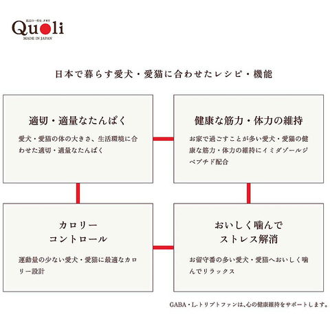 | 原材料 | 肉類(チキン*、チキンミール、チキンエキス、チキンレバーパウダー)、米*、小麦*、とうもろこし、ポテトプロテイン、チキンオイル、脱脂大豆、酵母細胞壁、フィッシュオイル(DHA源として)、ビール酵母、魚介類(フィッシュパウダー、魚肉抽出物(イミダゾールジペプチド源として))、でん粉、大麦若葉*、N11(好熱性微生物)、紫さつまいも*、マリンコラーゲン、GABA、ほうれん草*、ケール*、かぼちゃ*、植物性油脂、ミネラル類(塩化ナトリウム、カリウム、亜鉛、鉄、銅、ヨウ素)、ビタミン類(A、D、E、B2、B12、C、パントテン酸、コリン)、アミノ酸類(メチオニン、トリプトファン) *ヒューマングレード国産素材 |