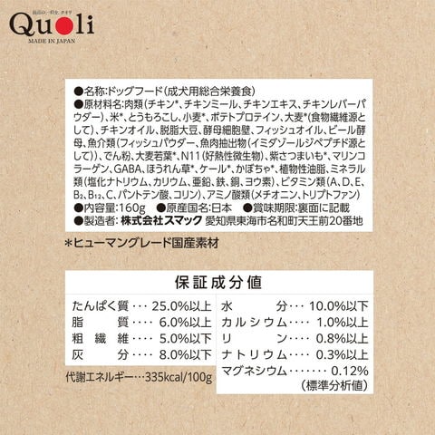 メーカー画像 ドッグフード Quoli(クオリ) 体重管理 成犬用 チキン 160g 獣医師監修 4970022014834 スマック 犬フード 犬 イヌ dog 犬用 いぬ用 犬の餌 犬えさ 犬餌 ペットフード カリカリ 成犬 総合栄養食 ダイエット ウエイトコントロール 減量 食物繊維 低脂肪 低カロリー 筋力 体力 健康維持 健康をサポート 品質管理 新鮮パック ヒューマンクオリティ ヒューマングレード 日本品質 厳選素材 鶏肉 野菜 国産 日本産 260312 y26m03 TISK 複数売り まとめ売り まとめ買い