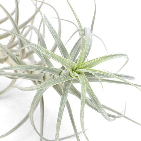 | 特徴 | 本種は、銀葉タイプの中でも特にトリコームがよく発達した有茎性のエアープランツです。全体に白みを帯びた葉姿が特徴で、近縁の銀葉種と比較すると葉は細くシャープで、やや硬質な質感を持ちます。葉は放射状に広がりながら茎を伸ばして成長し、整ったシルエットを形成します。銀葉の密度が高いため明るい場所でも葉焼けを起こしにくく、空間に軽やかで上品な印象を与えます。生育が進むと花茎をすっと立ち上げ、淡いピンク色の花苞と可憐な花を咲かせ、観葉期だけでなく開花期にも高い観賞価値を楽しめます。 |