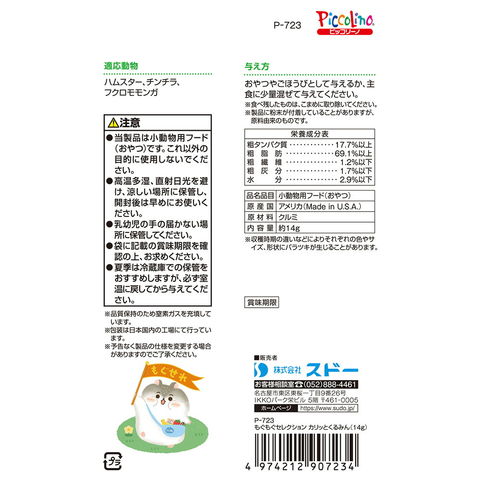 | ご注意 | ※本品は小動物用のおやつです。目的以外の用途では使用しないでください。 |