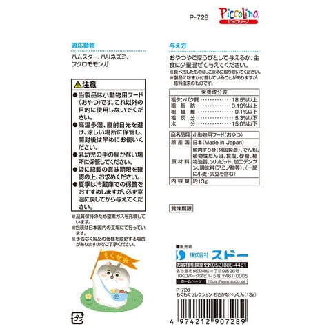 | ご注意 | ※本品は小動物用のおやつです。目的以外の用途では使用しないでください。 |