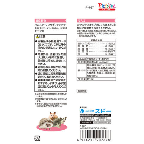 | ご注意 | ※本品は小動物用のおやつです。目的以外の用途では使用しないでください。 |