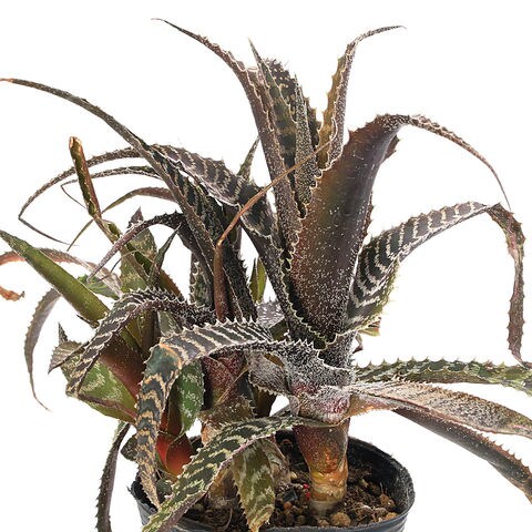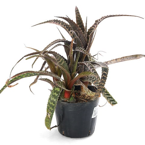 ・本種は地生性のブロメリアで、ロゼット状に広がる草姿が特徴です。 ・葉は厚みのある硬質な質感で、濃緑色から黒味を帯びた地色に、白色の波打つ横縞が入るゼブラ模様がはっきりと現れます。 ・同属の中でも葉色が暗く締まり、横縞のコントラストが強い点が際立ち、ワイルドで存在感のある印象を与えます。 ・光量を十分に確保すると葉色がより黒く発色し、模様も鮮明になります。 ・成株になると中心部から花茎を伸ばし小さな白色の花を咲かせますが、主に葉姿を観賞する植物です。 |