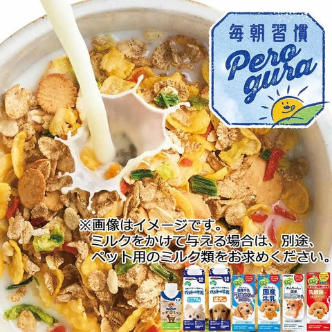 【ぺろっとグラノーラ】 ●おいしく、からだにやさしく、毎日を満たす、わんちゃんの新しい食習慣におすすめのワンちゃん専用グラノーラです。 ●そのままたべるとサクサク食感を楽しめ、牛乳をかけて食べるとさらにおいしさアップします。 ●ドライフードのトッピングにも使えます。 ●栄養成分にこだわった3種のフルーツ入りです。 【わんちゃんの国産牛乳】 ●乳酸菌(FK-23)約440億個と食物繊維を配合した愛犬用牛乳です。 ●毎日乳酸菌を摂取することで健康的な免疫力をサポートし、さらにお腹の健康維持をサポートします。 ●乳糖ゼロだからお腹にやさしい牛乳です。 ●九州産の生乳を使用しており国内基準の安心感です。 |