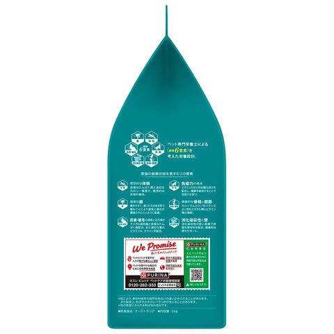 原材料 フィッシュ(サーモン、ツナ)(オメガ3脂肪酸源)、チキンミール、コーングルテン、小麦、食物繊維(ビートパルプ、セルロース、可溶性繊維(オリゴ糖源)、ライスファイバー)、米、脱脂大豆、鶏脂(オメガ6脂肪酸源)、小麦たんぱく、大麦、フィッシュミール、たんぱく加水分解物、酵母(βグルカン源)、ミネラル類(カルシウム、リン、カリウム、ナトリウム、クロライド、マグネシウム、鉄、銅、マンガン、亜鉛、ヨウ素、セレン)、カラメル色素、ビタミン類(A、D、E、K、B1、B2、パントテン酸、ナイアシン、B6、葉酸、ビオチン、B12、コリン、C)、アミノ酸類(メチオニン、タウリン)