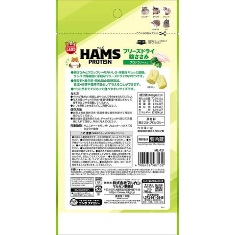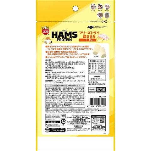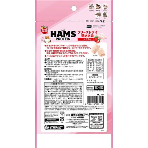 y26m03 メーカー画像 マルカン HAMS フリーズドライ鶏ささみ イチゴ入り 15g 4906456587125 ハムズプロテイン ML-720 ミニマルランド 小動物 小動物フード フード 餌 えさ エサ おやつ オヤツ ハムスター フェレット ハリネズミ リス モモンガ フリーズドライ 鶏ささみ ささみ 鶏ササミ ササミ 鶏肉 チキン いちご 苺 ストロベリー サクサク 動物性たんぱく カルシウム ビタミン 骨 元気 サポート 手に持って 食べやすい 無添加 砂糖不使用 食塩不使用 20260409 y26m04 kak 4906456587118 チーズ 4906456587132 ブロッコリー