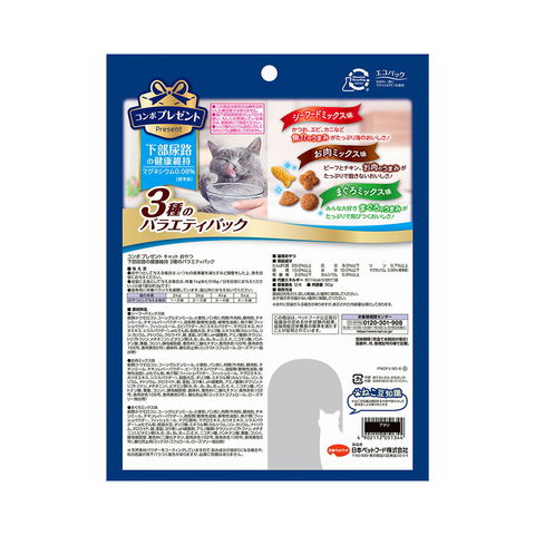 メーカー画像 コンボ プレゼント キャット おやつ 下部尿路の健康維持 3種のバラエティパック 90g×15 4902112051344 猫 ねこ 猫用 ねこ用 猫フード キャットフード ペットフード フード 餌 エサ ごはん 総合栄養食 カリカリ 猫おやつ 間食 下部尿路 尿路 サポート 健康維持 小分け アソート シーフード お肉 肉 まぐろ 鮪 魚 さかな フィッシュ ツナ 20260421 y26m04 ari