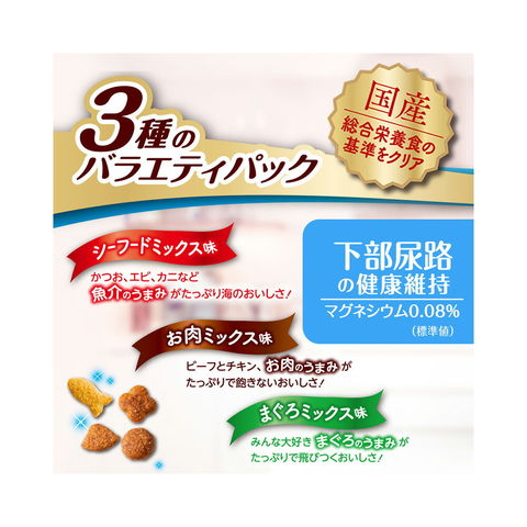 | 原材料 | 【シーフードミックス味】 穀類(トウモロコシ、コーングルテンミール、小麦粉、パン粉)、肉類(牛肉粉、豚肉粉、チキンミール、チキンレバーパウダー)、油脂類(動物性油脂、植物性油脂)、魚介類(フィッシュパウダー、フィッシュミール、エビパウダー、カニエキスパウダー、マグロエキス、カツオエキス、シラスパウダー)、α化でん粉、脱脂大豆、オリゴ糖、ミネラル類(カルシウム、リン、カリウム、ナトリウム、クロライド、銅、亜鉛、ヨウ素)、pH調整剤、アミノ酸類(タウリン、トリプトファン、メチオニン)、ビタミン類(A、B1、B2、B6、B12、D、E、K、ニコチン酸、パントテン酸、葉酸、コリン)、酵母細胞壁、着色料(二酸化チタン、食用赤色102号、食用赤色106号、食用黄色5号)、調味料、酸化防止剤(ミックストコフェロール、ローズマリー抽出物) 【お肉ミックス味】 穀類(トウモロコシ、コーングルテンミール、小麦粉、パン粉)、肉類(牛肉粉、豚肉粉、チキンミール、チキンレバーパウダー、ビーフエキスパウダー)、油脂類(動物性油脂、植物性油脂)、α化でん粉、魚介類(フィッシュパウダー、フィッシュミール、マグロエキス、カツオエキス、シラスパウダー)、脱脂大豆、オリゴ糖、ミネラル類(カルシウム、リン、カリウム、ナトリウム、クロライド、銅、亜鉛、ヨウ素)、pH調整剤、アミノ酸類(タウリン、トリプトファン、メチオニン)、ビタミン類(A、B1、B2、B6、B12、D、E、K、ニコチン酸、パントテン酸、葉酸、コリン)、酵母細胞壁、調味料、着色料(二酸化チタン、食用赤色102号、食用赤色106号、食用黄色5号)、酸化防止剤(ミックストコフェロール、ローズマリー抽出物) 【まぐろミックス味】 穀類(トウモロコシ、コーングルテンミール、小麦粉、パン粉)、肉類(牛肉粉、豚肉粉、チキンミール、チキンレバーパウダー)、油脂類(動物性油脂、植物性油脂)、魚介類(フィッシュパウダー、フィッシュミール、マグロ節粉、マグロエキス、カツオエキス、シラスパウダー)、α化でん粉、脱脂大豆、オリゴ糖、ミネラル類(カルシウム、リン、カリウム、ナトリウム、クロライド、銅、亜鉛、ヨウ素)、pH調整剤、アミノ酸類(タウリン、トリプトファン、メチオニン)、ビタミン類(A、B1、B2、B6、B12、D、E、K、ニコチン酸、パントテン酸、葉酸、コリン)、酵母細胞壁、着色料(二酸化チタン、食用赤色102号、食用赤色106号、食用黄色5号)、酸化防止剤(ミックストコフェロール、ローズマリー抽出物) |