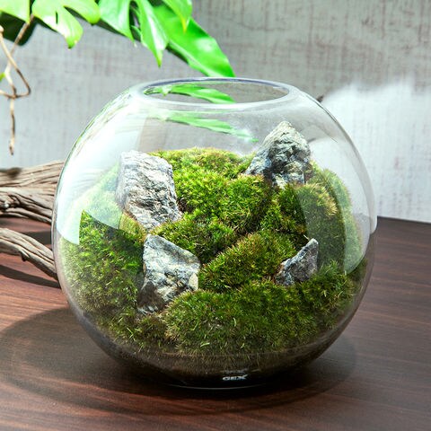 | 特長 | ●ガラス製容器「GEX グラスアクアリウム スフィア」を用いた苔レイアウトです。 ●ヤマゴケと風山石をレイアウト済み+植物育成用のLEDライトが付属しているので、簡単に苔テラリウムを飾れます。 |