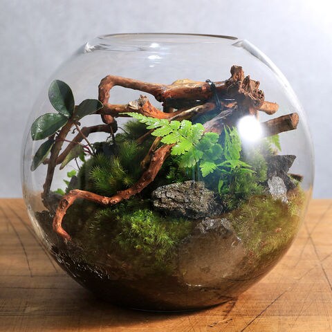 (観葉植物)苔テラリウム スフィア 装飾用流木+植物+ヒノキゴケ付き!(1個)育て方の説明書付