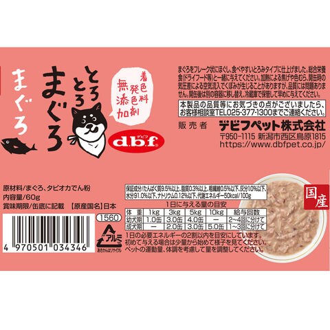 メーカー画像 デビフ とろとろまぐろ まぐろ 60g 缶詰 犬 ウェットフード ドッグフード 4970501034346 20250308 y25m03 mikari いぬ 犬フード 鮪 無添加 国産 日本産 栄養補完食 栄養補助食 フレーク とろみ 水分補給 ウエット ウェット opa2_choku