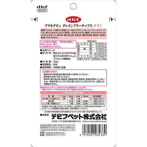 frditem_hidden メーカー画像 デビフ プリモデビィ グレインフリーチップス ササミ 30g 犬 おやつ 4970501034339 20250308 y25m03 mikari いぬ ドッグフード 犬フード 国産 日本産 穀物アレルギー 無添加 やわらか グレインフリー 間食 食塩不使用 スナック 鶏ささみ とりささみ