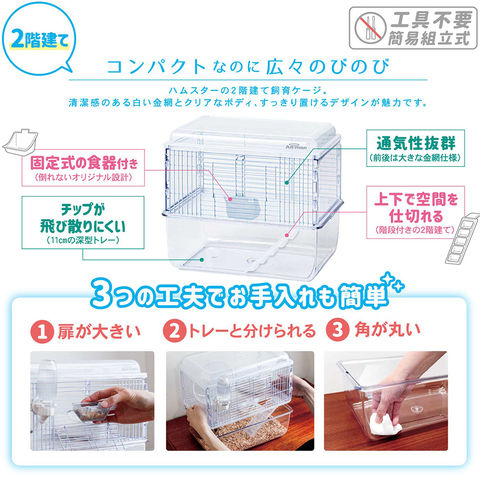 ●上下で空間を仕切れる階段付きの2階建てのクリアなボディで、インテリアに馴染みやすいケージです。 ●倒れないオリジナル設計の食器付き。 ●2つの面には金網を使用しているので通気性もよく、奥まで手が入りやすい大きな扉が特徴です。 ●11cmの深底トレーはチップが飛び散りにくく、2階部分をバラさずに取り外せるので、お掃除だけでなくチップ交換も簡単。 ●パーツの角も丸いから汚れもささっと拭き取りが可能です。 |