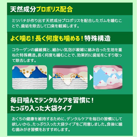 | 特長 | ●天然プロポリス配合の手に持って与えやすく、ワンちゃんがくわえやすいスティックタイプの歯みがきガムです。 ●コラーゲンの繊維質と、細かい気泡が複雑に絡み合った特殊な生地を重ねることで、しっかりとした噛み心地を持ちながら、食べきりしやすい独特の質感がうまれます。 ●特殊構造のガムを噛むことで、歯に絡みついた歯垢をこそげ落とし、また、長く何度も噛むことで、さらに効果的に歯垢を除去します。 |