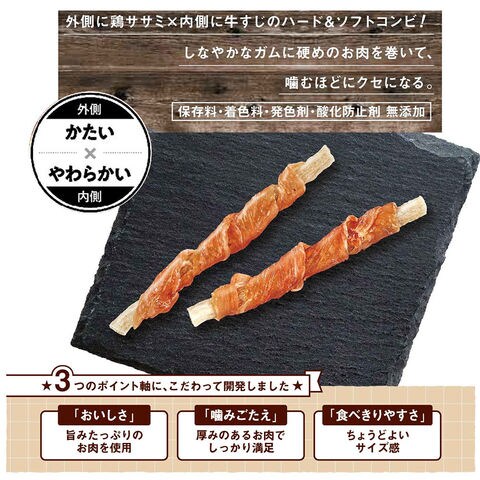 | 特長 | ●ハードな食感に仕上げた鶏ササミを、牛すじを使用したしなやかさのあるソフトガムに巻きつけたハード&ソフトタイプおやつです。 ●噛めば噛むほど素材の旨みがあふれ出る。 ●噛みごたえ・おいしさ・食べ切りやすさの3つのポイントにこだわった巻ガムシリーズす。 ●保存料、着色料、発色剤、酸化防止剤無添加。 |