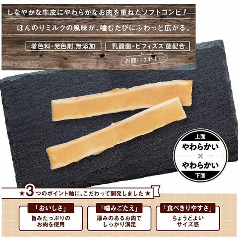 ●鶏ササミを使用したやわらかいお肉の上層と、しなやかなやわらかさに仕上げた牛皮ガムの下層の2層構造のガムです。 ●ソフトタイプでほんのりミルクの風味が噛むたびにふわっと広がります。 ●おなかにうれしい、乳酸菌とビフィズス菌を配合。 ●保存料、着色料、発色剤、酸化防止剤無添加。 |