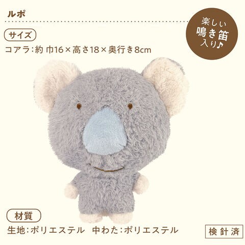 | 特長 | ●とろけるように極上タッチのぬいぐるみです。 ●少し大きめのルポはベッドでは枕にも使えます。 ●パピーには眠るときの寄り添いアイテムとしても活躍します。 ●楽しい鳴き笛入り。 |
