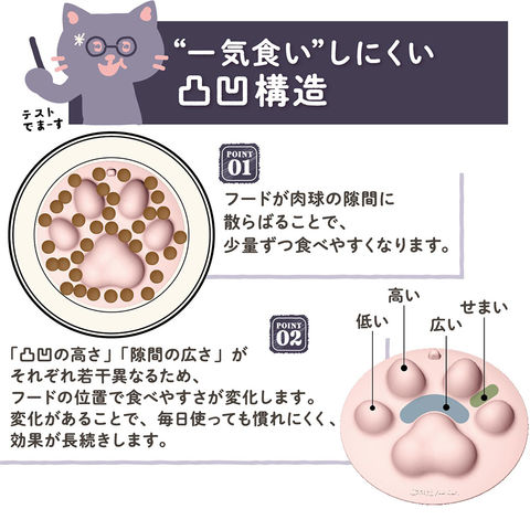 | ご注意 | ※本品は猫用早食い防止パッドです。目的以外の用途では使用しないでください。 ※熱湯消毒はできますが、変形・変質防止のため熱湯に長時間つけ置きしないでください。 ※漂白剤・シンナー・ベンジン・アルコールなどを使用しないでください。 ※食器乾燥機・電子レンジを使用しないでください。 |