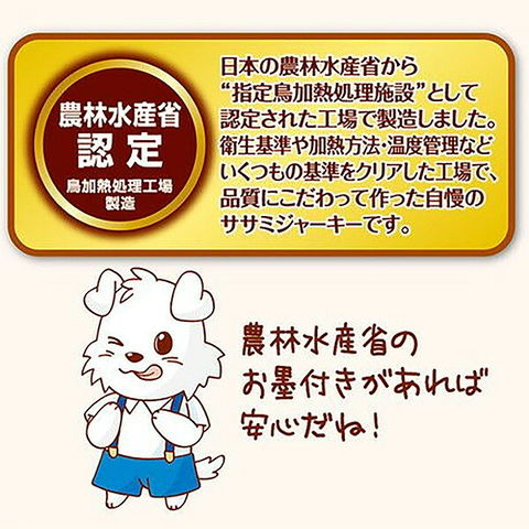 | 特長 | ●食べごたえ大満足、旨味たっぷりで味わい深い鶏ササミを2倍巻きにしたワンちゃん用ガムです。 ●ササミとガムの美味しさが味わえるスナックです。 ●日本の農林水産省から「指定鳥加熱処理施設」として認定された工場で製造しました。 ●保存料・着色料不使用です。 |