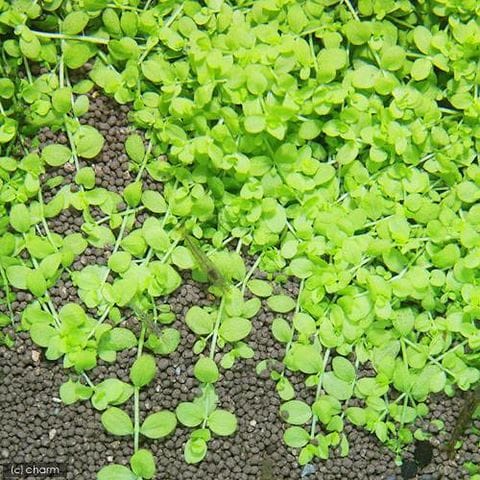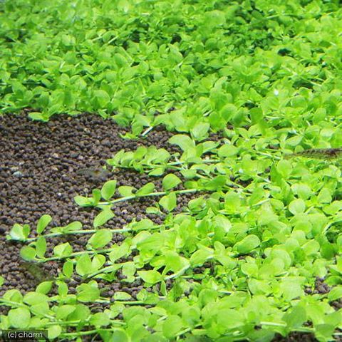 | どんな種類? | 育成難易度 → ★★★★☆ ゴマノハグサ科(Scrophulariaceae)の植物。 丸葉で明るい緑色の葉を規則正しく展開するラージパールの匍匐する種類です。有茎草としては貴重な前景草です。 ソイルなどにベッタリ匍匐しながら増えていき、密度が高くなってくるとこんもり育っていく性質を持っています。 気泡を付けやすい種類で、群生させると非常に美しいです。育成はラージパールほど早くないので、コケなどに注意します。 60cm水槽で3灯以上、中性~弱酸性、ソイル、CO2添加あり、液肥主体の施肥で育成しやすいです。茎の節目から根を出します。葉序は対生、無柄。施肥は液肥中心に行います。 新しい水を好む種類です。底砂が汚れていたりすると調子が中々上がらない場合が多くプロホースなどで掃除してから植え替えると状態がよくなることが多いです。 下葉を落としやすい種類の為、前景にはブリクサなど根元が見えないレイアウトにするとよいでしょう。 |