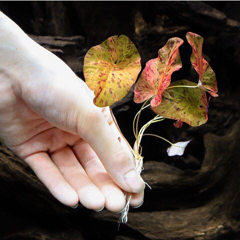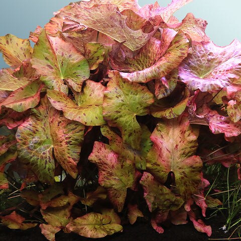 ニムファの中でも比較的小型のニムファです。タイガーロータスレッドと同じような模、葉の形をしています。 赤茶色の葉に濃い赤紫の斑が入る綺麗なニムファです。 育成は通常のタイガーロータスと大差はありませんが、高光量、CO2添加、低床の十分な肥料がある環境でより美しい発色に育ちます。 性質上、長期維持していると、光を求め水面まで柄を伸ばします。 水中で維持していきたい場合は柄が長くなってきた葉を株上1~2cm位のところでカットして頂くと柄が長くなりにくくなります。 ニムファの中でも小型の方なので、大型化するタイガーロータスよりもレイアウトなどで使いやすいです。 |