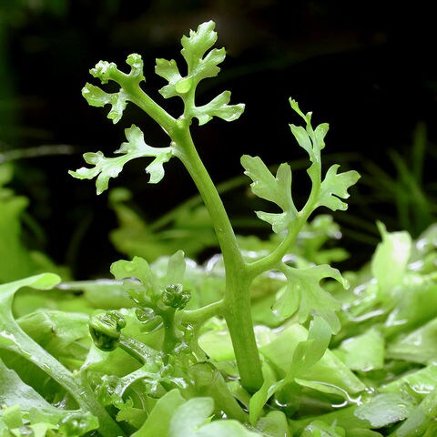2022年にギニア便で入荷したスプライトです。 黄緑色から緑色の羽状葉を展開し底床に挿して育ててもよし、水面に浮かせて育てると小株が発生して次々に浮き草のように育てることもできます。 メダカの産卵床やグッピーなどにも合う水草です。 葉は柔らかく、ライトグリーンで葉のいたるところから子株が生じたり、葉の裏に胞子を付けて増殖することができます。 育成は容易で、1000lm程度の光量にCO2の添加はあった方が良いですが、なくても育ちます。 弱酸性、ソイルもしくは大磯砂で育成でき、液肥主体の管理が好ましいです。 |