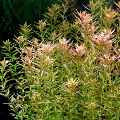 | どんな種類? | 育成難易度 → ★★★☆☆ ミソハギ科(Lythraceae)の植物。花びらのように葉が展開する姿美しい赤系水草の代表種の仲間です。水中葉は柔らかく、後景にまとめ植えすると薄ピンク~赤色が映え非常に美しいです。 葉序は十字対生、無柄、披針形ないし卵形です。黄緑色から赤茶色に染まります。 綺麗に維持するにはある程度の環境で60cm水槽で3灯以上、酸性から弱酸性下、 CO2添加、軟水、強光、水中の肥料分を十分に含んだ環境で綺麗に育てやすい種です。 また赤色を維持するには赤系のライト、高光量と鉄分の追加は必須です。 特に3灯などになる場合は1本を赤系の水草育成系の蛍光灯にすると赤い葉を楽しめます。 増殖は主に差し戻しがメインで、水面近くになると盛んに脇芽を伸ばし始めるので、それを差し戻しで増やします。 |