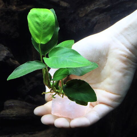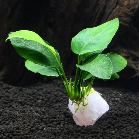 | どんな種類? | 育成難易度 → ■<☆☆☆☆■ 石や流木に着生(張り付く)する性質がある点、水質に幅広く対応し、低光量にも強く、CO2の添加も必要ないことから幅広い用途に使用できる種類です。 アヌビアスをメインとした水槽は非常に落ち着いた印象を与えます。着生すると言う性質を利用すれば立体的なレイアウトを作成したり、底床が薄くなりがちで、対応器具も少なめで本格的に水草を楽しむにはパワー不足となりやすい小型水槽においても本格的なレイアウトを楽しめる1種です。 強い光や、肥料は必要無く、逆にどちらも抑え気味の方が綺麗に育てることができます。CO2の添加が無くても問題なく育ちますが、添加をした方が成長が早いです。コケが付きやすいのですが、葉はしっかりしており食害を受けることがあまり無いので、ヤマトヌマエビやオトシンネグロ等のコケ取り能力の高い生体を多めに入れましょう。 着生させる際は既に伸びている根は出来るだけ短くカットしてしまいます(伸びた根には物に張り付く力がありません)。有茎草の様に光に向かって成長する事が無い為、観賞に適した位置になるように調整して構いません。くくり付ける場合は、ウッドタイト等の使用がお勧めです。糸状のものは着生する前に腐ってしまったり、株を傷めたりすることがあるのであまりお勧めできません。 環境や維持についてはうるさい所は無いのですが、急な温度変化(特に低水温)や、地下茎のような部分を傷つけたり、通水性が悪くゴミや排泄物が大量に溜まった場合、底床に埋め込んでしまった場合は調子を落とす場合があります。また真新しいソイルを使用した水槽や、RO水で維持している水槽など、極端に硬度の低い水槽でもやはり調子を落とすことがあります。 |