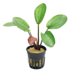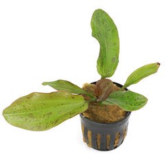 | どんな種類? | 斑の入るやや赤みがかった新芽が美しい改良品種です。 エキノドルス コーディフォリウスをもとに改良されたと思われ、原種ほどではありませんが水上でも大型に育ちます。 水中、水上共に楽しめるオススメのエキノドルスです。 育成難易度 → ★★★☆☆ オモダカ科(Alismataceae)の植物。英名Echinodorus。 Echinos[ツンツンと尖った]+doros[ホース]→尖った果実、という意味。 ある程度の照明(60cm水槽で20W2灯程度)と、できれば外部式フィルターや水中フィルター等のCO2を逃がしにくいタイプのフィルターの使用がお勧めです。 また肥料分の吸収の多くを根から行う為、底床は厚めに敷いて下さい。古くなった葉はコケが付きやすくなり、色もくすんできますので、できるだけ付け根の近くからハサミでカットしてください。 植え替えを行うと株が弱ります。頻繁に植え替えを行うと株の体力を消耗しきり成長が止まってしまったり、最悪枯死してしまう場合もあるので注意が必要です。 逆に長期間植え替えずに維持すると1株で60cm水槽の半分を占めるほどのサイズとなる場合もあります。 植え直しを行うことによりサイズを調整することができます。 ただこの場合、根がかなりの広範囲に渡ってはえているいることが多いので、底床にはさみを入れて根をカットしながら慎重に引き抜いてください。 サイズを抑える方法としては他に葉の枚数を5~6枚に抑えて維持する方法が有ります。 植え替えを行うよりも簡単で手間も掛かりませんが、見た目が貧相になりやすいので、この維持方法を取る場合はある程度の株数をまとめ植えするのがお勧めです。 根張りが強く一度根付くと小型魚程度の力では抜かれる事が無い為、水草を引き抜いてしまう魚や底床をほじってしまうコリドラス等の水槽にもお勧めです。 ただし根付くまでには時間がかかるので根元を石等で覆うなどの工夫は必要です。 |