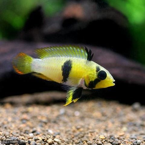 | 混泳の注意点 | 流木やシェルターなどの陰に産卵するケーブスポウナーです。発情したメスは体色全体が黄色く色づき、オスメス共にテリトリーを主張するようになります。ペアが十分に発情していれば、シェルターなどに産卵をしメスが卵を孵化まで保護します。 産卵前は発情したオスに追いかけられるメスが、産卵後は卵を保護するメスに追いかけられるオスがボロボロにされることがあるので必要に応じて隔離をする必要があります。また混泳魚も追い回されることがあります。 卵が孵化し稚魚が自由遊泳後しばらくはメス親が稚魚を保護します。自由遊泳を開始した稚魚は孵化したてのブラインを食べることが出来、この頃には親魚は別の水槽に移した方が良いでしょう。 |