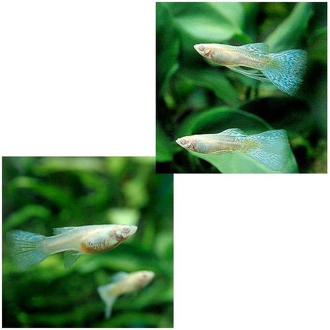 | 繁殖 | グッピーは非常に繁殖力が強く、卵ではなく稚魚を産む卵胎生です。 オスは尻ビレが細長くなった交接器(ゴノポディウム)を持ち、メスは交尾後1ヶ月程で仔魚を産みます。 メスのお腹が膨らみ、尻ビレ付近の黒い部分が目立ってきたら出産が近いです。 初産では産仔数は少なく、大きなメスは100匹近く仔魚を産み、1度の交尾で数回仔魚を産むことができます。 メスがせわしく泳いだり、水槽の下でボーっとする行動が見られたら、稚魚が他魚や親魚に食べられないように産卵ケースや別水槽に移動してください。 グッピーの稚魚はすぐに細かな人工飼料を食べられます。餌の与えすぎによる水質の悪化に注意して、少量の餌を1日に数度与えます。 1ヶ月程度でオスメスが判別でき、3ヶ月程で交配可能です。 |