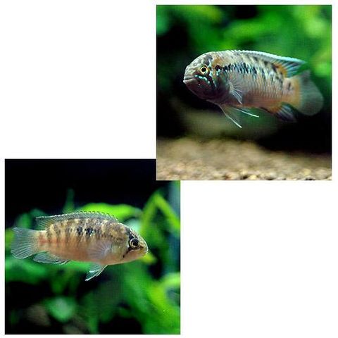 | 繁殖 | 十分に成熟したペアを産卵に適した弱酸性の軟水で飼育し、発情を促します。 繁殖はペアで行われ、流木や石などの基質に産卵するラミレジィと同じオープンスポウナーで、素焼きの植木鉢片やプレート状の基質を使うと良い結果が得られます。 稚魚は孵化したてのブラインシュリンプを口にすることができます。 |