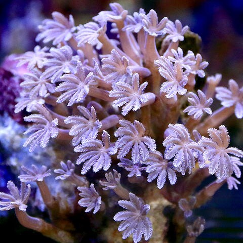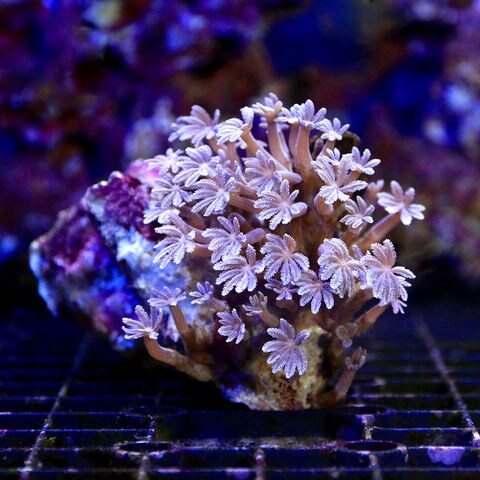 | 種類詳細 | 淡い色彩と雪の結晶を思わせる姿が繊細で美しいソフトコーラルです。 調子がよいとスターポリプ同様、這うようにして旺盛に増えていきます。 他のサンゴに比べてポリプが大きく、可愛らしいお花のようなサンゴで人気があります。 褐色をはじめポリプ全体がグリーンになる個体や、センターが蛍光グリーンになるものなどのカラーバリエーションがあります。 ポリプの形状としては、細身のナロータイプ、幅の広いヘアリータイプ、雪の結晶のようなスノーポリプなどが存在します。 |
