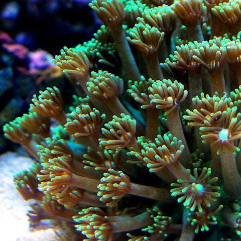| 飼育のポイント | 水質は常に硝酸塩やリン酸塩など栄養塩類が極めて低い環境が適しています。 水流は強すぎると弱ってしまうので、触手が緩やかにたなびく程度にサンゴ全体にあたるような太い水流が適しています。 照明は強めのものが向いていますが、赤や緑の強いタイプはブルー系のランプを多めに照射すると色が浮き立ち美しい姿になります。 微量元素の不足に弱い面があるため、カルシウムリアクターやアラゴナイト系の底床材、または添加剤の使用が有効です。 刺胞毒が強く、近くに他種のサンゴがあると毒に弱い種類は弱ってしまうので接触しないよう注意が必要です。 |