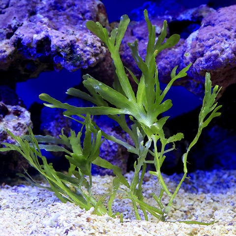 | 種類詳細 | 匍匐(ほふく)しながら横に伸びる「カウレルパ」の仲間です。 ヘラ状の葉状体を密生させるオーソドックスな海藻で、岩に活着しながら育ちます。 ライブロックや底砂を覆うように広がり水草の前景~中景草のような使い方のできる海藻です。 |