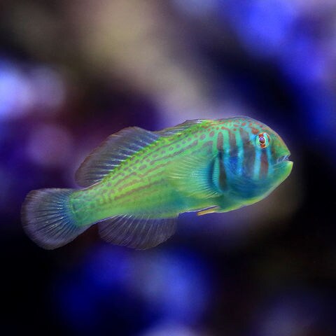 | 種類詳細 | 緑を基調に赤いラインとスポットの入る、ユニークな外見の小型ハゼです。 自然下ではミドリイシ等のサンゴを住処とし、相利共生を行っています。 捕食者から身を守るために体表から毒を出す為、混泳相手には注意が必要です。 |