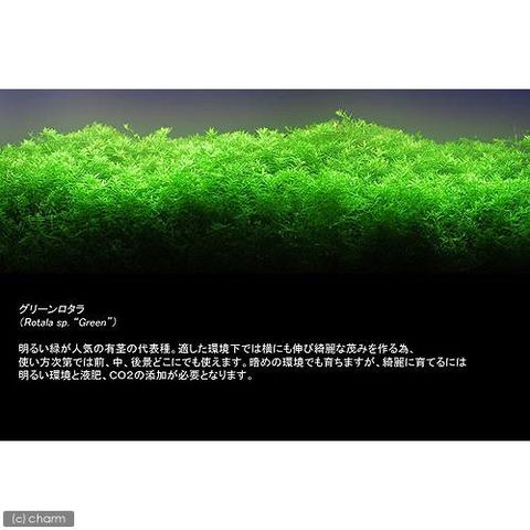 | グリーンロタラ | 明るい緑の細い葉を持つ有茎草の人気種です。レイアウト水槽などにも、特に多く使われる種類です。 明るい環境下では一旦横に這った後、各節目から上に向かように伸びると言う成長の仕方、トリミングに強く、成長も早い為、 トリミングを繰り返してある程度好きな形に整えることができるなどの特徴があります。 |