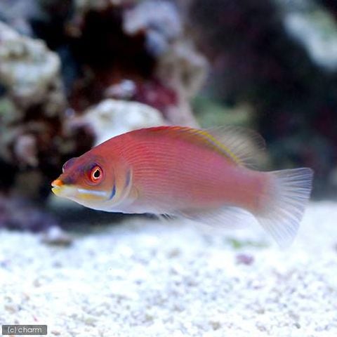 全身が暗めのオレンジ色をしたモチノウオの仲間で、眼の下に白いラインが一本入るのが特徴的です。 性格はややきつく、体格の似ている種類とは争う事があります。 |